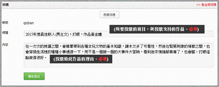 2 會員請於12/31之前,到活動專區頁面「2015年度大投票:女主文」,留言寫出你的一票要投給入圍的哪部作品,以及投票給此作品的理由。完成者即可參加投票抽獎。