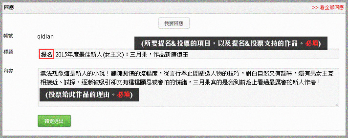 2 會員請於12/31之前到活動專區頁面「2015年度大投票:最佳新人(女主文)」,留言寫出你想提名的作品,以及提名&投票給此作品的理由。完成者即可參加投票抽獎。